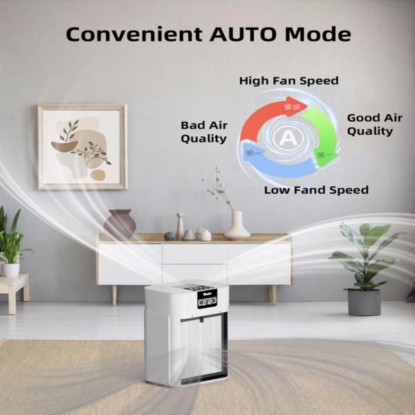 • [3-Fan Speed & 5 Timers] Air purifier offers three gears of air flow intensity for you to choose from - low, medium, and high. Not sure which fan speed to choose? Air Purifier Auto Mode can automatically adjust fan speed based on real-time air quality. 5 timer options (2/4/6/8/12H) are convenient for your life.