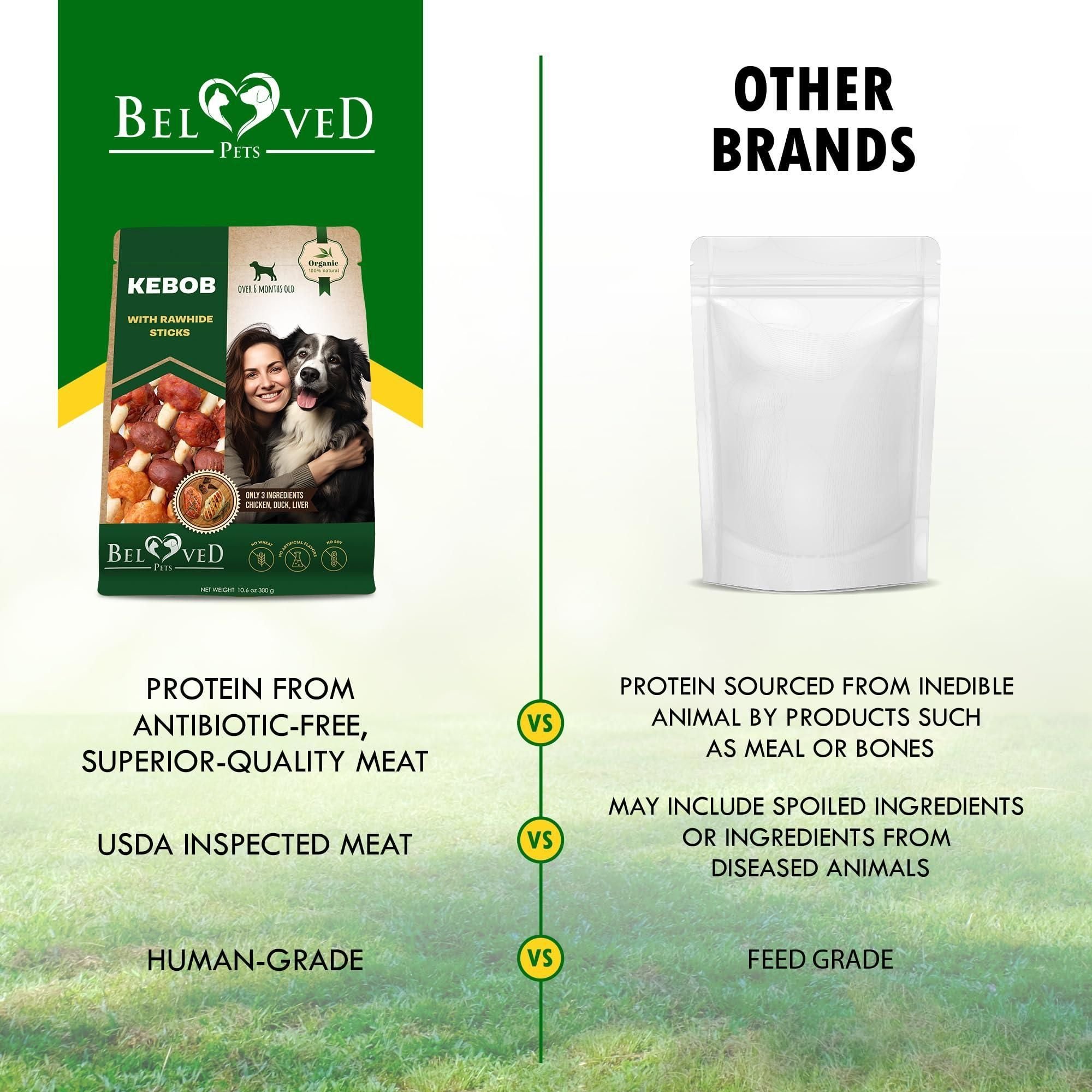 1.premium organic kabob treats: elevate your dog's snacking experience with our gourmet kebab treats, crafted from organic, human-grade ingredients. these rawhide sticks delights with duck, chicken liver are perfect for large and small breed dogs & puppies and aggressive chewers, providing a dental-friendly chew with every savory bite. dental health and gluten-free: promote strong teeth and healthy gums with our dental dog chews. gluten - free and packed with essential nutrients, these chewy