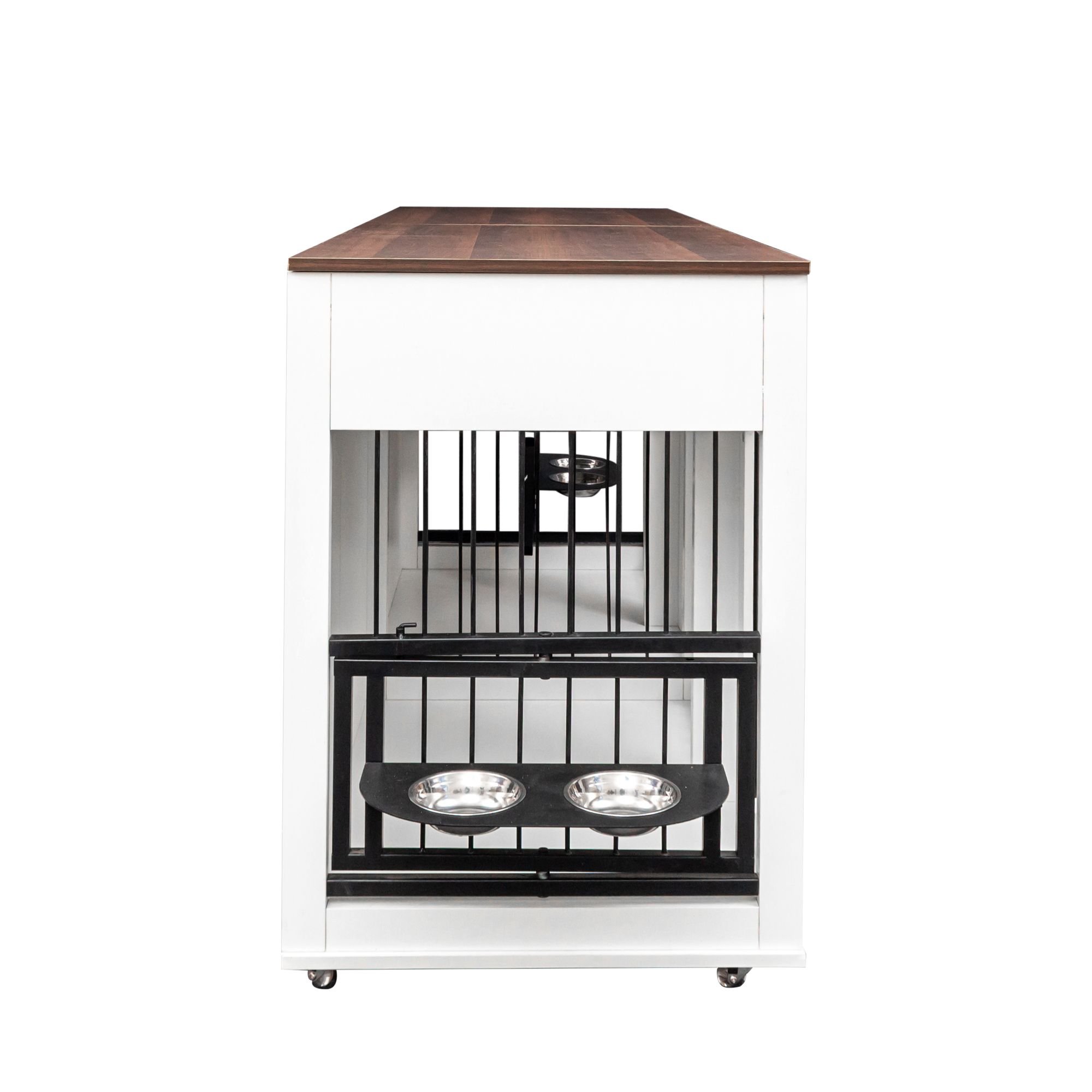This designer style indoor dog cage can add beauty to any corner. The color scheme of white and walnut is simple and atmospheric, easily matching various home decoration styles