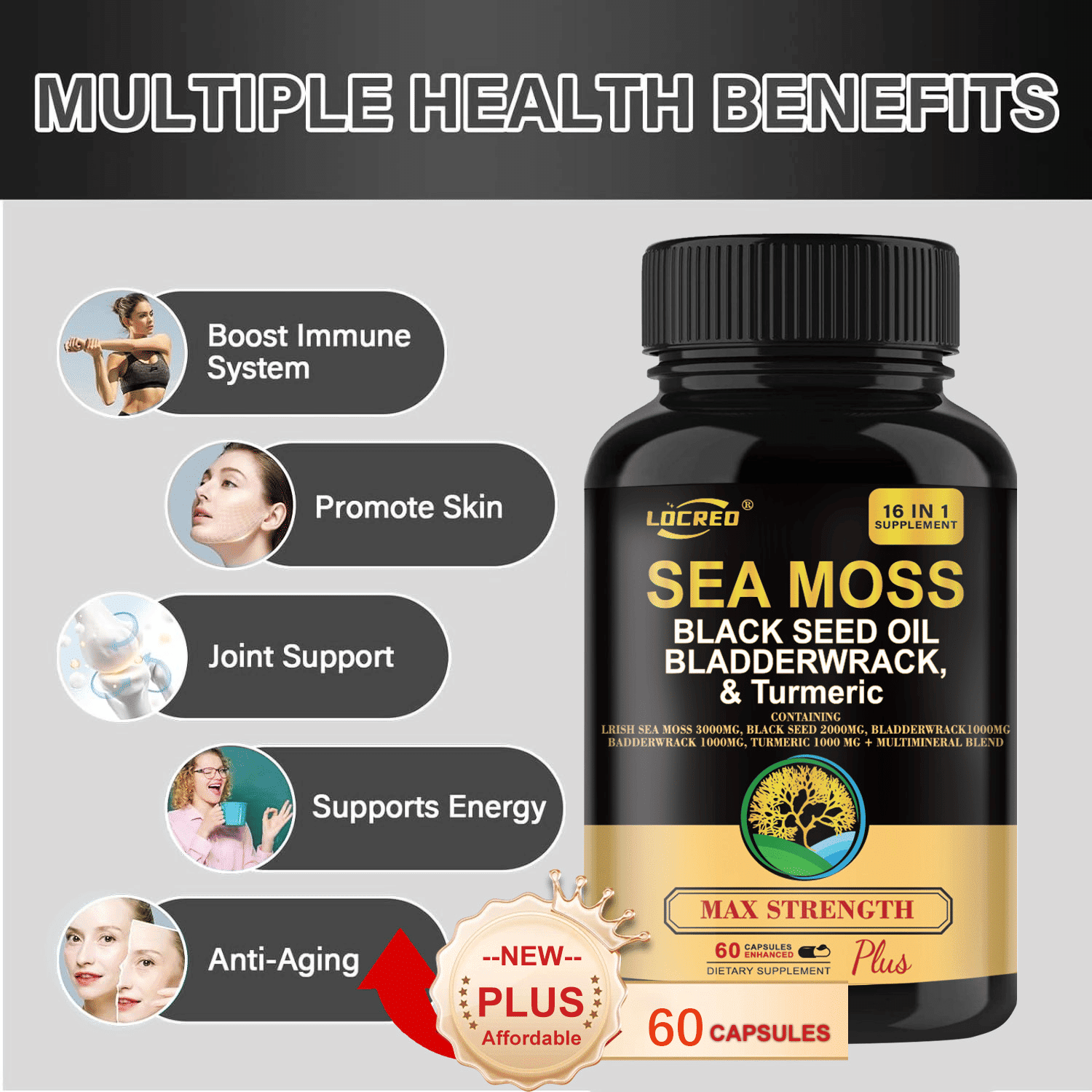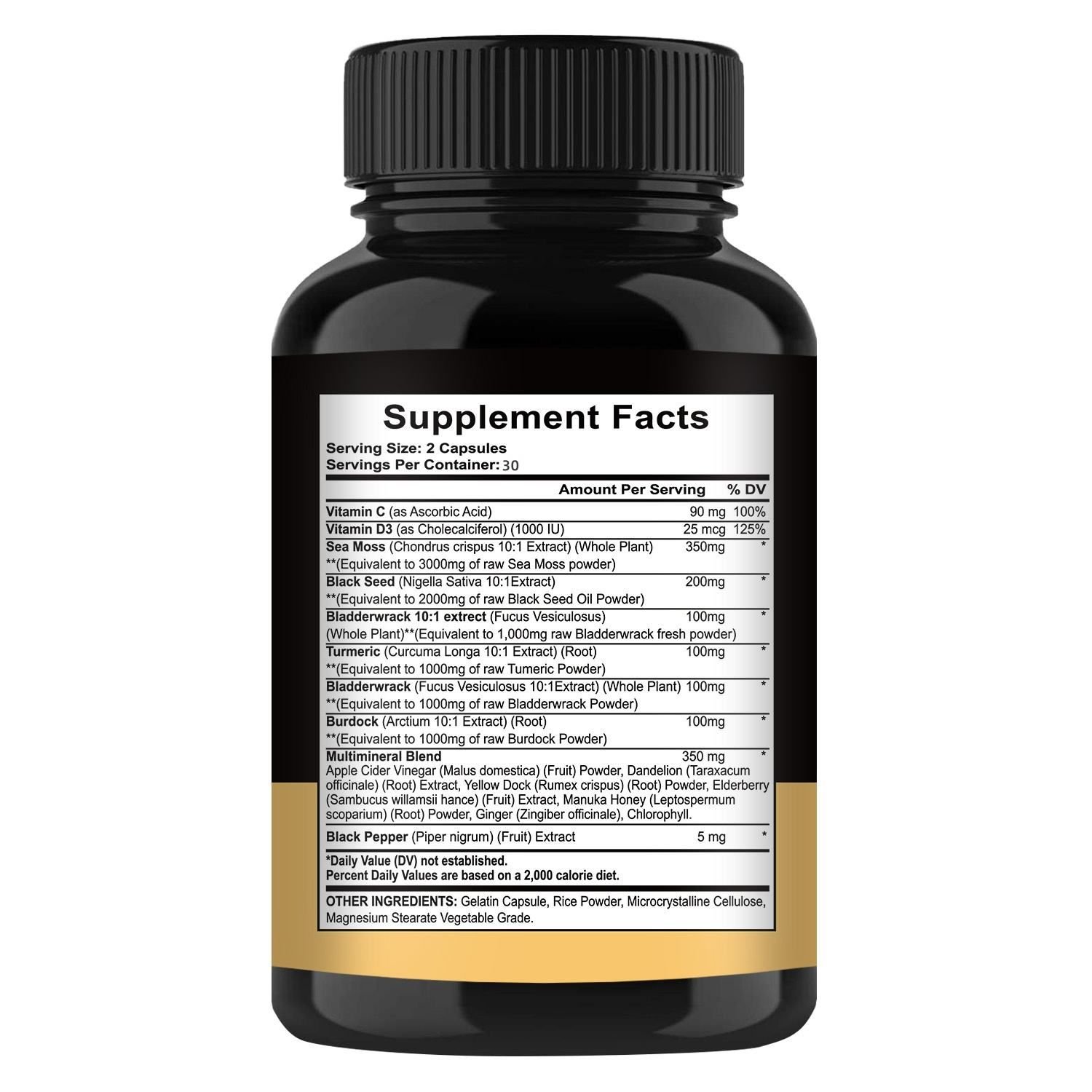 Sea Moss Capsule are designed for both women and men. presents the world's most comprehensive 16-in-1 formula, Vitamin C,Vitamin D3,sea moss,black seed,bladderwrack 10:1 extrect,turmeric,bladderwrack,burdock,multimineral blend,black pepper,daily value(DV) not established.And other ingredients:gelatin capsule,rice powder,microcrystalline celluose,magnesium stedrate vegetable grade.can giving you a comprehensive single-dose solution that you will ever need.